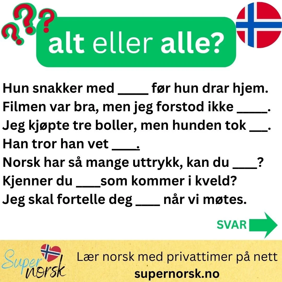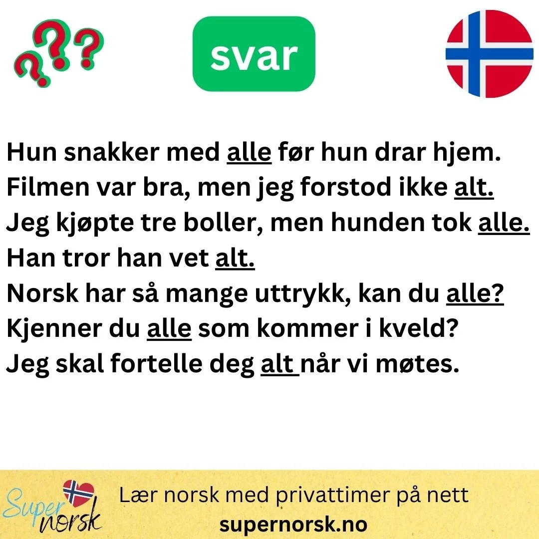 alle = tellelige substantiv + personer (countable nouns and persons / everyone)