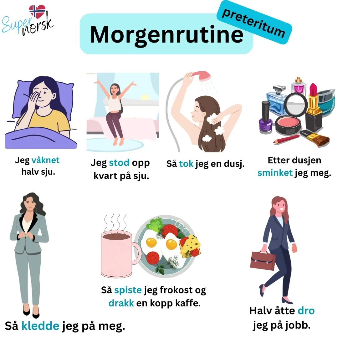 Hva gjorde du i morges? Morgenrutine i preteritum PreteritumVokabular 16. des. Skrevet av Supernorsk HUSK!Verb på plass 2!ADVERB + VERB + SUBJEKTSå tok jeg en dusjHalv åtte dro jeg på jobb preteritumvokabular Supernorsk